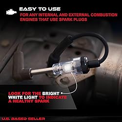 [Quickly Diagnose Misfire Issues]: Use the ABN Spark Plug Spark Tester to diagnose engine ignition issues and defects; Troubleshoot spark plug connections, contact points, and bad cables [Service Your Vehicle]: From motorcycles and lawnmowers to cars, trucks, and boat motors, this small engine spark plug tester tool works for internal and external combustion engines that use spark plugs [Easy to Use]: Connect the coil checker tool between spark plug and plug wire then start engine; If sparks are sent, in line spark tester will mirror spark by lighting; Bright white light indicates healthy spark while jumping and dim color indicates weak coil or plug [Keeps You Safe]: 11.3-inch (28.8cm) long spark plug tester engine ignition coil tester tool indicates inconsistencies and sparks in a way that keeps you safe from electric currents [Quality You Can Trust]: Each small engine spark tester automotive spark tester tool features a 3-inch (7.6cm) nickel-plated shaft and a 7-inch (17.8cm) rubber straight boot and cable that ensure durability and long-lasting use