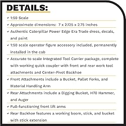 Recommended Age 14+ Years, Not recommended for play Authentic Cat Machine Yellow paint, CAT trade dress, tire tread design, and detailed cab interior, including operator Left and right stabilizers with pads raise and lower, boom raises, lowers, and swings, and interchangeable work tools Center pivot backhoe design, front wheel steering with oscillating axle 7 x 2 1/8 x 2 3/4 inches