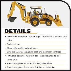Recommended Age 14+ Years, Not recommended for play Comes in a collectible metal box with photos and specifications of the real machine Detailed operator in cab and tires with authentic tread design Boom with stick that raises and lowers with 180 degree swing, left and right stabilizers with pads and operating bucket raise and lower Measures approximately: 4⅜" x 2¼" x 1⅞"