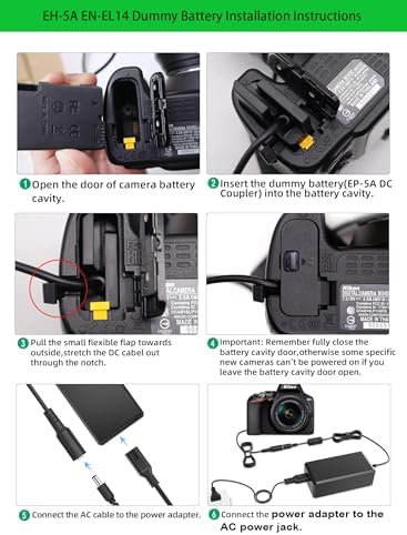 • [MODELOS COMPATIBLES]: El Kit Adaptador de Alimentación AC EP-5A Batería Dummy EN-EL14 (Coupla DC) compatible con Cámaras Nikon D3100, D3200, D3300, D3400, D3500, D5100, D5200, D5300, D5500, D5600, Df, COOLPIX P7000, COOLPIX P7100, COOLPIX P7700, COOLPIX P7800.