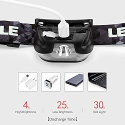 - Battery Specification: Battery Type: Polymer battery Battery Capacity: 1200mAh Charging time: About 3 hours Discharging time of the White light: full light: about 4 hours; low light: about 25 hours Discharging time of the RED light: About 30 hours Rechargeable. USB cable is included. No need to buy batteries anymore. Multiple lighting modes: White light: full light, low light and strobe. Red light: full light and SOS mode. White light and red light can be controlled at the same time separately. Easy to operate. Having 2 separated buttons for either RED LED or WHITE light makes choosing the right mode pretty easy and very convenient. Lamp head adjustable. The lamp head are 45 degrees adjustable for oriented lighting. Flexible elastic head strap. The easily adjustable, elastic, soft and comfortable headband fits for kids and adults alike.Super bright. Light your way up to a 164 yards (150m) with this 150 lumen bright headlamp. Waterproof. The IPx4 rating means it is protected against splashing water from all angles. Widely Used. Great for running, jogging, camping, fishing, biking, hunting, hiking, climbing, walking your dog at night. Package Included: 1 x rechargeable headlamp 1 x usb cord Click the "Add to Cart" button now and enjoy your hands-free lighting at night. About LE Lighting EVER, abbreviated to LE, focuses on creating the best lighting experience. Only high end LED and advanced optical design are adopted. Enjoy lighting with LE.