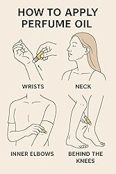 - Para obtener los mejores resultados, se recomienda aplicar aceites perfumados puros en las siguientes áreas del cuerpo y los puntos del pulso: detrás de las orejas, dentro de los codos, abajo de la espalda, interior de la muñeca, detrás de las rodillas, base de la garganta y zona del ombligo.