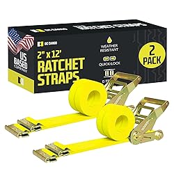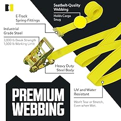 SECURE AND SAFE - These 2" x 12' Heavy Duty Ratcheting Logistic Cargo Tie-Down Straps have an assembly break strength of 3,000 pounds and a Safe Working Load Limit of 1,000 Pounds. Easily Secure Cargo Loads In Your Box Truck, Cargo Van, Pickup Bed, Flatbed/Utility Trailer, Enclosed Trailer, or Warehouse With The Convenient And Versatile E-Track System; each yellow E-Track strap tie down has E-Track spring fitting attachments at each end that click into slots on your E-Track rails or singles DURABLE - Never replace your straps again! These Ratchet Tie-Down Cargo Straps are made out of durable yellow polyester webbing (strap material) that is water- and UV ray- resistant. They won't shrink or stretch even when wet. The steel ratchet is made to ensure the most reliable trailer and truck cargo securement throughout the bumpiest rides. EASY TO USE - See the image for 6 Easy How-To Steps. 1. Open the ratchet by lifting the lever and threading the loose strap end around the bottom rod of the spindle (ratchet handle) 2. Pull the excess webbing through and pump the strap tight until it is wrapped securely around your cargo load 3. Clip the lever down and your load is secure! PROTECT YOUR PROPERTY - These Tie Down retractable ratchet straps Are Made Out Of The Most Reliable Materials Available With The Highest Standard Workmanship; click the images to see more ways to use these fabulous E-Track Tiedown Cargo Tork Strap Straps for trucks, trailers, vans, sailboats, kayaks, cars, motorcycles, RVs, and other tie down needs USA BASED COMPANY - American Service, American Quality, along with our DC Cargo 100% satisfaction guarantee