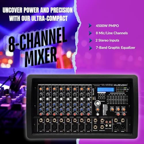 - Specification: Ultra-compact 8-ch power mixer with 4500W PMPO, 8 mic/line channels with 48V phantom power, USB/SD MP3 play, ultra-low noise preamp, 2-band EQ, high headroom, balanced inputs, 1 Aux send, master & REC outputs, 7-band EQ, headphone jack, 110V/220V switchable, 22lbs, size 16"x13"x11".