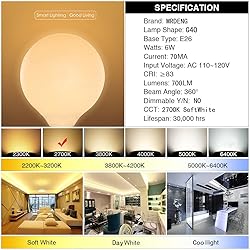 - [PARAMETERS] Model:G40 Socket: E26 Power:6W Input Voltage: 120VAC/60Hz Lumen:700lm Feature:DIMMABLE Bean Angle:360 Color Temperature:2700K CRI:>=83 Material:Glass+Aluminum Lifetime:20000H Dimensions:125x125x135MM Applications:Home, Office, Hotel, Market,Store, etc. Lifespan:Lasts at least 13 years if used 3-5 hours per day. [COSTOMER NOTICE] 1.Cut off the power supply before installation. 2.Lamps are fragile, please handle with care and follow instructions before installation. 3.Replace LED or other accessories with MRDENG products for better experience. 4.For your safety, do not attempt installation without a qualified electrician.