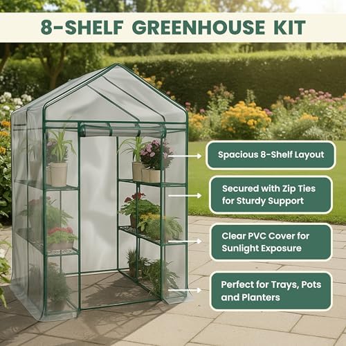 - 8-SHELF GREENHOUSE KIT - The 8 greenhouse shelves provide plenty of room for trays, pots, or planters of anything you want to grow. Each shelf comes with zip ties to secure them to the sturdy metal frame, preventing them from tipping over.