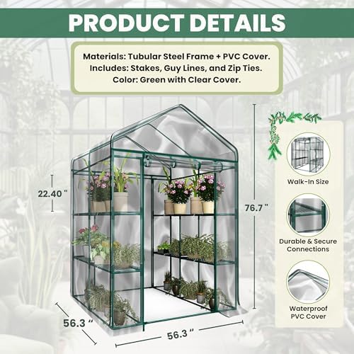 - PRODUCT DETAILS - Materials: Steel Frame and PVC Cover. Dimensions: (L) 56.3” x (W) 56.3” x (H) 76.7”. Includes: Stakes, Guy Lines, and Zip Ties. Color: Green with Clear Cover.