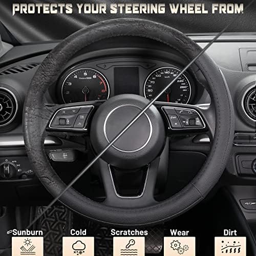 • NON-SLIP AND PROTECTION: Constructed from less slippery microfiber leather exterior and rubber lining, this car wheel cover adds secured safety performance when driving. It also protects your steering wheel from sunburn, scratches, fading, wear, and dirt.