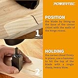- Introducing the Square Corner Chisel by POWERTEC . This corner chisel tool was designed to provide you with an easy, accurate and time-saving solution to creating a 3/8 square corner for many of your woodworking and framing projects. Including both, an auto align capacity and smooth spring-loaded cutter edge, this unit will ensure impressive and high precision results in no time. Truly Versatile Perfect for squaring up the inside corners of hinge mortises, recessed door hinges, recessed cabinet hinges, wood flooring stock, router hinge recesses, and picture frames. If your project requires a precise 90 degree corner, this tiny tool is the perfect accessory for you. Premium Construction Unlike some corner chisels made with carbon steel blades, this compact item features an exceptionally sharp high speed steel (HSS) blade that offers greater wear resistance and the ability to withstand high temperature increases without losing its temper, ensuring faster, higher precision cuts. It also possesses an anodized aluminum body with corrosion resistant properties for long-term durability. Although this unit comes ready-to-use, it is also incredibly easy to disassemble for sharpening purposes. Easy To Use Design Step 1: Place this corner chisel in any corner or recess. Step 2: Tap it with a hammer to remove access waste. Step 3: Admire your handiwork A clean, 90-degree square inside corner. Package Contains 1 - Square Corner Chisel (hammer and hinge not included) POWERTEC is a leading manufacturer of high quality woodworking tools and accessories, machines, and an assortment of OEM replacement parts. We are committed to exceeding expectations, while bringing the latest innovations, technology, and product development to the industry.
