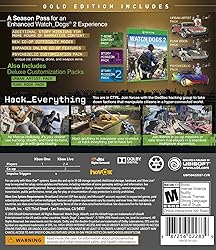 Get the ultimate Watch Dogs experience with the Watch Dogs 2 Gold Edition! Gold Edition includes the base game + Deluxe Packs + Season Pass. SEASON PASS - continue your hacker's journey with special missions, customization items and more great DLC. DELUXE PACKS - include premium customization items to personalize your character, weapons, vehicles, drones and more.