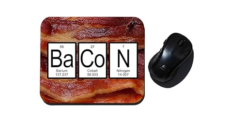 - This mousepad has many useful features: It makes your mouse track really well, much better than the mouse would track on an actual piece of bacon. It shows any doubters that bacon is an intellectual food, as noted in the Periodic Table of Elements. It will not be eaten by crazed bacon-lovers. They may nibble on it a bit, but not enough to do any real damage. It will make your bacon-loving friends extremely jealous. It will also scare away bacon-haters. In case of a flood, it would keep your mouse dry. What more could you ask for in a mouse pad?