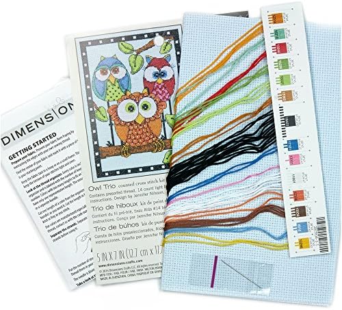 - Owl trio cross stitch kit includes (1) set of 100% cotton cross stitch threads, (1) 14 count blue Aida, (1) stitching needle, (1) easy-to-follow instructions.