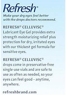 Refresh Celluvisc: An extra-strength gel drop that delivers exceptional comfort. This innovative formula, meticulously crafted as Refresh's thickest gel ever provides targeted relief for moderate dry eye symptoms, day or night. NDC Code(s): 0023-4554-30