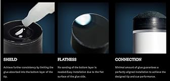 - Kamui Clear Features: Achieve further consistency by limiting the glue absorbed into the bottom layers of the tip. No sanding of the bottom layer is needed. Easy installation due to the flat surface of the glue side. Minimal amount of glue guarantees a perfectly aligned installation to achieve the designed tip and cue performance. For installation, use liquid base super glue such as Tiger Insta-Cure Glue in order to maximize the adhesion to the Kamui Clear tip. Using the gel type super glue tends to be too thick resulting in longer drying time and a weak bond.