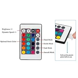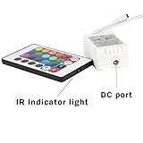 - Features: -This LED light controller uses 12V input power and has a 4 contact plug for a RGB strips. When installing just line up the marked arrows. -You can choose between many different solid colors, solid white, flashing, strobing, adjust brightness, and on/off all from the wireless remote. -This simple to used 24-key IR RGB controller to control our RGB flexible LED strips. -It has 16 Static colors and 4 color changing modes. -It also could adjust the brightness of the static color and change the speed of the color changing. Specifications: *Supply voltage:DC 12V *Output:Three CMOS drain-open output *Connecting Mode:Common anode *Max load current:2A each color *Cable with Receiver length:10cm *Cable with Pin adapter length:20cm Warning: 1.Supply voltage of this product is DC12V never connect to DC24V or AC220V 2.Never connect two wires directly in case of short circuit 3.Lead wier should be connected corrently according to colors that connecting diagram offers Warranty: Warranty of this product is one year,in this period we guarantee replacement or repairing with no charge,but exclude the artificial situation of damaged or overload working Package includes: 1 x 24Key Remote 1 x Controller Box
