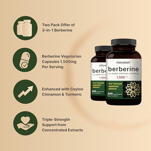 - 2 packs of berberine vegetarian capsules, 97% pure berberine, 3-in-1 with real Ceylon cinnamon and turmeric.