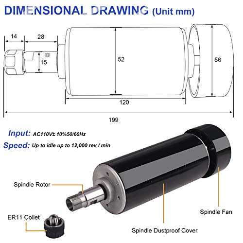 - 🛠️【Motor de husillo CNC de 500 W】- Voltaje de funcionamiento: 100 V CC, Potencia: 500 W, Entrada: 110 V CA, Velocidad: hasta ralentí hasta 12.000 revoluciones/min, Par: 5000 G/CM. Resistencia de aislamiento: > 2 megaohmios, rigidez dieléctrica: 400 V. Longitud del motor: 200 mm, el husillo de alta precisión se agota 0.01-0.03.