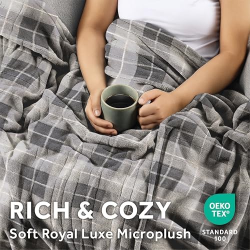 Sunbeam Electric Throw Royal Luxe Microplush Heated Blanket, 4 Heat Settings, 4-Hour Auto Shut-Off, Fast Heating, Warm and Cozy, Grey Rodeen Plaid, 50" x 60"
