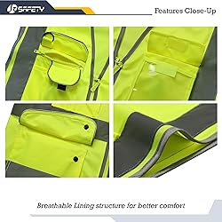 - Type: 100% Polyester High Reflective Safety Vest with 360° Visibility; Light Weight, Durable, Machine Washable. Features: Sleeveless PPE with high visibility 2 inches wide Reflective Strips along the shoulders, chest, waist and back area. It provides a 360° reflection while you are in daylight, low light condition or at night. 9 functional frontal pockets design with PVC transparent ID pocket; pouches for mobile phone or small flashlight; 2 large utility plastic snap button pocket for daily utility items; Applications: Industrial: Construction Workers, Railway Workers, Security Personnel, Surveyors, Emergency Respond Teams, Landscaping Workers, Sanitation Workers, Airport Ground Crews or TSA Personnel. Leisure activities: Running, Biking and Motor Riding. Certifications: Full compliance with ANSI/ISEA 107 Class 2 Type R Unisex: This safety vest is great for both men and women. Work safety play safety Thanks for supporting JKSafety.