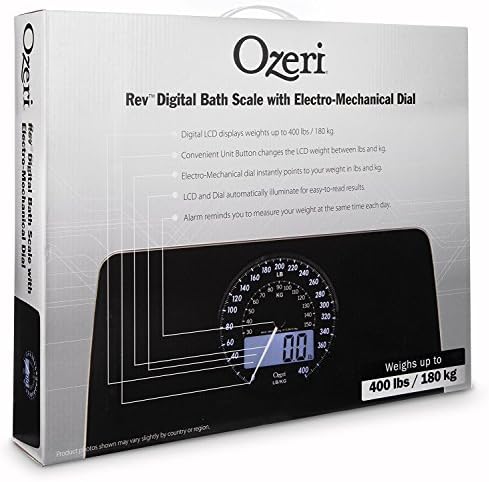 The Ozeri Rev Digital Bathroom Scale with Electro-Mechanical Weight Dial is the world's first weight scale to incorporate a synchronized electro-mechanical Dial and LCD that automatically illuminate and point to your weight in lbs and kg, for easy-to read results in all light conditions and from any angle. Boasting a visually arresting design, the Ozeri Rev scale features a huge 5.5 inch mechanical dial display with an integrated digital blue-backlit LCD, accented by stylish chrome to create a distinctive retro look, and displays digital results with class-leading 50 gram Sensor Technology. This professional quality scale features an oversized platform made of impact-resistant tempered glass with slip-resistant feet for ideal stability, and a new built-in alarm that reminds you to measure your weight at the same time each day. The Ozeri Rev Digital Bathroom Scale uses 4 high-precision sensors that weigh up to 400 lbs (180 kg) in 0.1 lbs or 0.05 kg (50 gram) increments. Whether your goals are weight loss or muscle gain, the Ozeri Rev features the latest generation of StepOn technology to display your precise body weight upon stepping onto the scale, with no tapping required. The Ozeri Rev Digital Bathroom Scale is auto-calibrated and automatically turns off to conserve battery life. It runs on 3 AA batteries (included) and features a Low Battery Indicator.
