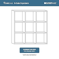 - Organize your space with the ClosetMaid Cubeicals collection. With cube storage organizers, the square shelf openings can store and organize hobbies, décor, books, media and office supplies. They are also compatible with 11 in. Cubeicals fabric bins to hold loose items or clutter that you want to keep concealed in a storage bin. Store your items in these attractive, compact units available in multiple cube configurations: 2 cube, 3 cube, 4 cube, 6 cube, 8 cube, 9 cube, 12 cube or 3-2-1 step cubes. From your office and living area to other rooms, these cubes will meet all your storage needs! Back panels are included to add an extra flair to the design for a more upscale look. The sturdy frame allows you to stack multiple units (excluding 3-2-1 cube) or place side by side to create a large storage area. Most of the cubes configurations can also be used vertically or horizontally for a versatile look. Use these organizer bookshelves around your home as they also come in a variety of style, neutral finishes to match your décor. All hardware is included for easy assembly and stacking if necessary. The ClosetMaid Cubeicals collection is ideal for your space!