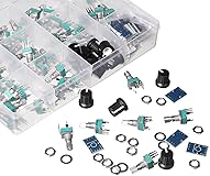 - 60 pcs PCB (RV097) Potentiometer Assortment This modern type of Potentiometer is mainly used for onboard PCB mount, and SMT projects. Tight and compact dimensions, small body and low tolerance. Can be used for offboard wiring as well with the included PCBs. The box Includes: B1K 6 pcs B5K 6 pcs B10K 6 pcs B20K 6 pcs B50K 6 pcs B100K 6 pcs B200K 6 pcs B500K 6 pcs B1M 6 pcs A100K 6 pcs 60 pcs nuts 60 pcs washers 15 pcs black knobs 15 pcs PCBs for offboard wiring or breadboarding