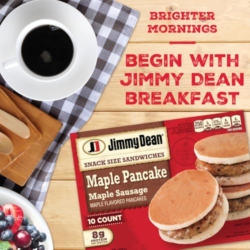 Enjoy breakfast any time of day with Jimmy Dean Frozen Snack Size Maple Pancake and Sausage Sandwiches. Featuring maple flavored sausage between two griddle pancakes, our snack size sandwiches are delicious to the last bite. With 6 grams of protein per serving, these tasty little sandwiches are perfect for breakfast or snacking. Simply microwave and serve dunked in maple syrup for breakfast at home or on-the-go. Includes 10 pancake sandwiches. Jimmy Dean once said, "Sausage is a great deal like life. You get out of it what you put in." Which pretty much sums up his magic formula for having a great day. Today, Jimmy Dean Brand brings you many ways to add some sunshine to your morning. Because today's your day to shine on.