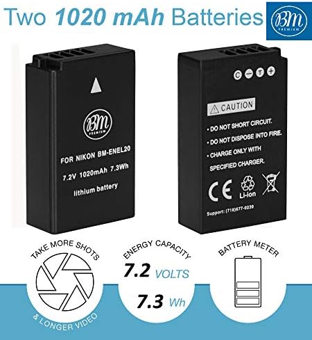 BM Premium Pack de 2 baterías ENEL20, EN-EL20a y cargador de batería dual USB para Nikon Coolpix P950, P1000, DL24-500, Coolpix A, 1 AW1, 1 J1, 1 J2, 1 J3, 1 S1, 1 V3