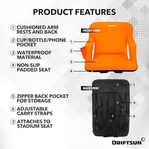 • COMFORTABLE STADIUM SEATING - Made out of durable waterproof polyethylene, the high-density PU foam cushion makes the stadium chairs for bleachers with back support the best option for your long games. The Driftsun seats are the perfect gift for sports fans.