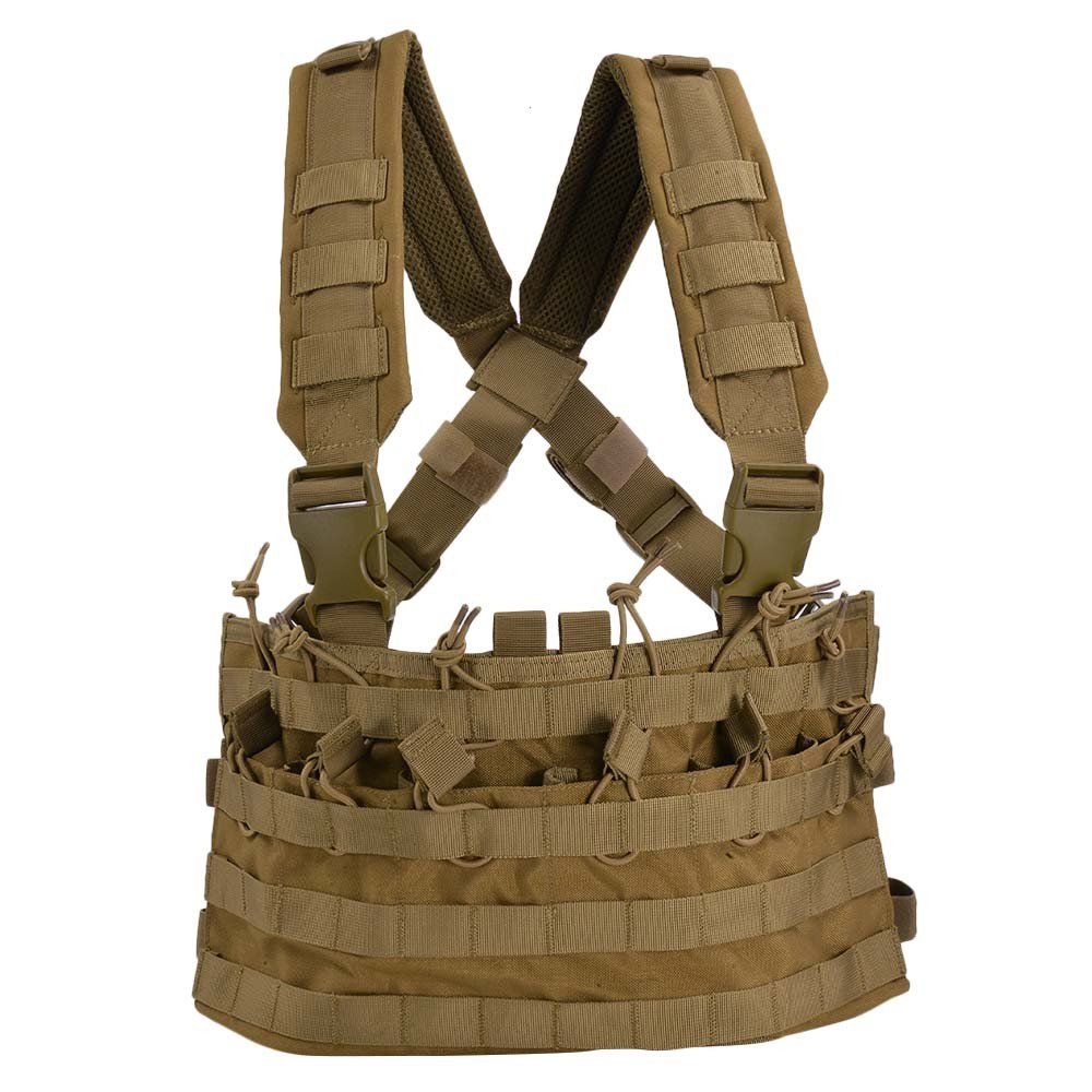 The Condor Modular Chest Set features 7 built-in mag pouches and 3 internal mesh pockets. There is webbing for modular attachments and an internal pocket with webbing for modular attachments. The chest platform is adjustable and removable, and the waist is adjustable. There is also padded shoulder straps for comfort, and there is a built-in hydration carrier (bladder not included). The size is adjustable from Large to X-Large.