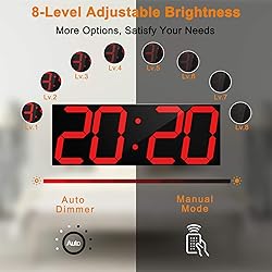 【6-inch Red LED Number with 8 Level Adjustable Brightness】6-inch numbers and time is long-distance readable and identity. It is good viewing experience indoor and suitable for anywhere because the LED is bright and easy to read. Some buyer complained the LED clock was too bright, now we have upgraded the 8 brightness adjustment, ensure the time is readable in the daytime and the display won't disturb your sleep at night. Auto dimmer will give a big help if you don’t want to control the digital clock. 【Frameless and Ultra-thin Design】Unlike the other digital wall clock which has a thick border in the market, our brand large number digital clock using the shell which is redesign by us. The use of ABS plastic ensures that the wall clock is fire-retardant, lightweight and strong. There are two hanging holes and standback support for mounted the clock on the wall or place on the table. 【Corded Electric and Energy Saving】Corded Electric is the best choice and the stablest power for this large digital wall clock. As we have known, LED is very energy saving and long usage time, so our clock also has this advantage. 10 feet USB cable can plug in the laptop, PC, power bank. (we don’t recommend using the power bank.) A CR2032 coin cell can be installed to ensure that the large digital clock remains accurate when disconnected from the power supply, but the coin cell does not power the digital clock.There is no battery cover, it is designed . 【Huge and Visible Countdown Clock】This countdown timer supports 364 days 23 hours 59 minutes 59 seconds ultra-long countdown time. Also can set for the minute or seconds countdown. Nobody will miss the countdown because of the 6-inch huge red numbers. We updated the user manual and took a video tutorial for countdown function, if you don’t know how to set it, just contact us to get the video tutorial and new version user manual. 【More Details are been Promoted】4 memory chips were added to the clock; Upgraded the wall clock CPU chip, provide the more precise timing; Upgrade the LED display refresh rate, more stable display and good for your eyes; Upgrade the remote control distance for 49 ft; (without any obstacle.) We do our best to provide a more useful and accurate digital wall clock.