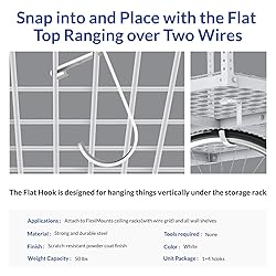 100lbs Tested, 50lbs Rated Weight Capacity: Our hook undergoes rigorous double load testing (100 lbs) to ensure unmatched safety and durability Specially designed only for FLEXIMOUNTS ceiling storage racks and wall shelves with wire grid decks. Not compatible with FLEXIMOUNTS tube frame racks or flat shelf boards. Please double-check your rack type before purchasing to ensure a perfect fit No tools required, applied to garage storage directly Scratch-resistant and powder coat finish Hang bikes, tools, sporting goods, lawn chairs, and much more