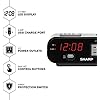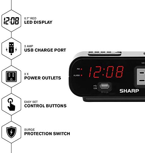 Sharp Digital Alarm Clock with 2X Power Outlets with Surge Protect and Rapid Charge USB Port - Grey Outlets