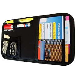 - ORGANIZE YOUR SURROUNDINGS AND SIMPLIFY YOUR LIFE!Are you tired of digging in the glove box to find your license, registration and insurance information? Looking for something to hold your pens, mini notebook, receipts, or any other small routine travel item?THE MOST EFFICIENT CAR DOCUMENT ORGANIZER ON AMAZON.A simple and minimalist design, with three pockets and two pen holders, makes this car visor organizer perfect for keeping your small and vital driver essentials close and instantly accessible when needed.01. No more rummaging through the glove compartment. 02. Opens and closes easily without having to look up when driving. 03. See what you are grabbing in the see-through mesh pockets. 04. Full length pockets for vehicle documents. 05. Elastic pocket openings to easily slide in your documents. 06. Tight pockets to ensure nothing falls out whether the visor is up or down. 07. Sturdy cardboard backing to fit flat against car visor. 08. Convenient for everyday use. 09. Waterproof, easy to clean, and completely odorless. 10. Makes your car look tidy and organized.Visor Organizer Size: 12" x 6.9" (maximum width 9").GET ORGANIZED NOW, REDUCE STRESS AND MAKE LIFE EASIER! With Fancy Mobility car visor organizers, you will not only tame the clutter but stay organized for years to come. Our visor organizers are the best available on the market with a quality superior to any other brand. LOOK NO FURTHER! Fancy Mobility sun visor organizer is clearly the best choice with its five-year money-back guarantee. It is a RISK-FREE purchase you should not pass up.Click the yellow "Add to Cart" button at the top of this page and grab yours now!