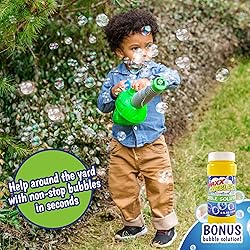 LOTS OF BUBBLES: Help around the yard with your very own bubble leaf blower! The continuous stream of bubbles offers all day entertainment with the push of the button. Blow tons of non-stop bubbles in seconds without losing your breath. PROMOTES ACTIVE PLAY: This adorable battery-operated toy leaf blower is a fun way to get kids up and moving. Help encourage imagination and role play fun for awesome outdoor play. REALISTIC SOUND: With its realistic design and mechanical sounds, the blower helps to promote pretend play and encourages kids to use their imagination. Help teach the value of chores while engaging in tons of bubble fun. EASY TO USE: Just pull the button once to create a continuous stream of bubbles. Allow 30 seconds and hold blower upwards for the bubbles to flow. Watch as children have a blast with this cute bubble toy! BUBBLES INCLUDED: Includes a 4- fl ounce bottle of premium Maxx Bubbles bubble solution. Save your bubble bottle to fill with solution for next time!