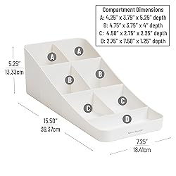 Customizable and lightweight yet sturdy: Arrange single-serve coffee pods or utilize larger compartments for creamer, cups, and lids with ease Versatile for various condiments: Transition effortlessly from morning coffee essentials like sugar, cream, and tea bags to afternoon condiments like ketchup, mayonnaise, and utensils, making it a versatile addition to any boardroom or breakroom Space-saving solution: Declutter your countertops by filling all seven compartments, instantly creating a streamlined and organized space Sleek and stylish design: The black organizer seamlessly blends into your home or office decor, adding a touch of sophistication to your space Perfect dimensions: Measuring 7.25 inches deep x 15.5 inches wide x 5.25 inches tall (18.42 x 39.37 x 13.34 centimeters), this condiment organizer slides smoothly into even the smallest spaces, keeping your coffee condiments neatly stored