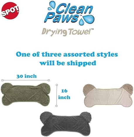 The SPOT Clean Paws Chenille Microfiber Dog Towel is a must-have for pet owners who want an easy, effective, and stylish way to dry their furry friends. Made from super absorbent chenille microfiber, this towel quickly soaks up water, making it perfect for drying your pet after baths, walks in the rain, or a day of play at the beach. Its extra-durable construction ensures it stands up to frequent use, while its machine-washable design allows for hassle-free cleaning. Unique corner hand pockets give you a secure and comfortable grip, making it easy to dry your pet thoroughly, even for those hard-to-reach areas. Whether you’re drying wet fur or muddy paws, this towel gets the job done efficiently and keeps your home clean. Measuring 30"" x 16"", it’s perfectly sized for dogs of all breeds and is also great for drying small pets like cats. The towel is available in three stylish colors—sage, tan, and grey—to complement your home and pet's style. Customers will receive one of these colors at random, adding a fun surprise to your purchase. Its lightweight and compact design make it easy to store or take along when traveling with your pet. Designed with both functionality and convenience in mind, the SPOT Clean Paws Towel not only helps keep your pet dry but also reduces messes in your home. It’s the perfect solution for rainy days, outdoor adventures, or everyday grooming routines. Add this high-quality, versatile towel to your pet care essentials today and enjoy the ease of keeping your furry friend clean and comfortable.