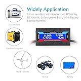 Bright blue backlit LCD display, easy reading. 12 gauge wire take higher volt and current. It is indispensable for analyzing, testing and troubleshooting any DIY DC power project. Very accurate in giving DC volt, ampere and wattage Operates from 4.8V to 60V or 0V to 60V with optional auxiliary battery. Measures 0-150A, resolution 0.01A; Measures 0-60V, resolution 0.01V; Measures 0-6554W, resolution 0.1W; Measures 0-65Ah, resolution 0.001Ah; Measures 0-6554Wh, resolution 0.01Wh Measuring Current (A), Voltage (V), Watts (W), Amp-hours (Ah), Watt-hours (Wh), Peak Amps (Ap), Minimum Volts (Vm), Peak Watts (Wp). Widely application battery tester, can test Solar Power batteries and chargers Multifunctional Tester: Evaluate RC battery charging efficiency.Measure power and energy consumption of any battery powered device. Predict model airplane flight time,Choose the best propeller/most efficient motor .Check for wiring and connector power loss.Ensure peak currents are safe for motor, ESC & Battery as well as wiring and connectors Notice: This watt meter was designed to be safe in systems unsing less than 60V and carrying current up to 150A. DO NOT EXCEED THE LIMITES