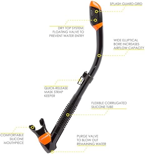 - The dry top valve eliminates water entry when submerged. A soft silicone mouthpiece reduced drastically jaw fatigue. Bottom purge valve to blow out the remaining water.