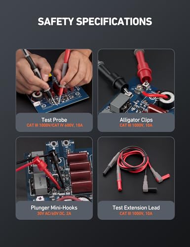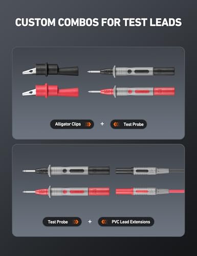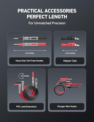 - DISEÑO HUMANIZADO: El aislamiento PVC removible en las pinzas de aligátor lo protege contra el polvo y la oxidación. Sondas de prueba delgadas y afiladas para un uso más fácil en espacios muy estrechos. Puntas de sonda más largas para mayor facilidad de uso.
