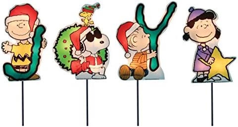 From the Peanuts Collection Officially licensed merchandise Your all-time favorite Peanuts characters are here, spreading Christmas "JOY" Product Features: Pre-lit with 25 clear mini lights 13" white lead cord 6" white tail cord Spacing between each character: 19" Lighted length: 68" long Overall length: 82" long Easy assembly; each character connects to an extension pole and a yard stake Additional Product Features: Contains end-to-end connectors, allowing you to connect to other lighted items (not to exceed 210 watts) UL listed for indoor or outdoor use Comes with ground stakes, spare replacement bulbs, and fuses Set also comes with suction cups, for hanging in a window if you desire 120 volts, 60 hertz, 0.12 amps, 14.4 watts Approximate dimensions of each character: 8"H x 6"W x 1"D Stake dimensions: 12"H Material(s): PVC/plastic/glass bulbs/wire