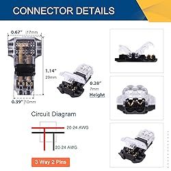 ROCK SOLID CONNECTION - Brightfour low voltage wire connector solves the problem that many connectors become loose because of the varying temperatures etc. After a few tests, you will see our wire splice connectors still hold tight, and keeps good contact. They stand out with reliable secure connection than other 3 way wire connector. NO MORE SPLICING PESTY LITTLE WIRES - Wire taps have always been annoying. Our T tap wire connectors are absolutely inspiring. With innovative copper clasp connection design, our t tap wire connectors save you from Peeling or Stripping, Cutting, Soldering, even Welding wires like the “old school” way. They take care of all the connections with ease and kept everything clean and easy to manage, provide a much simpler and quicker installation process. Cut the install time by half. USE THE CORRECT WIRE - Fits well for 20, 22 and 24 AWG stranded and solid core electrical wires. As for 18 gauge wire, not all 18 AWG wires are with the exactly same diameter in the market. You may be able to use these wire splice connectors with 18 AWG wire. SMALL ENOUGH TO BE TUCKED - With a compact size, and transparent surface, these small wire connectors are practically invisible and compact to meet your individual needs. Especially nice for wiring led lights. WIDE APPLICATIONS - Perfect for all vehicle/audio/video/LED light strips installation and other electrical wiring projects, like car audio, LED turn signal lights, car's cigarette lighter wiring, speaker wire splice, etc. Our t tap wire connectors can be widely used for various low voltage and high voltage electrical hookups. If you also need other shape connectors, please click into our store to find more connectors. PACKAGE INCLUDES - 12 pack 3 Way Dual Pins low voltage wire connectors.