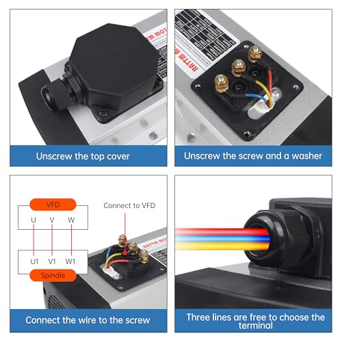 - 【How to wring it to Inverter】The spindle’s terminal U1, V1, W1 are connected separately to inverter’s terminal U, V,W. Connect any 2pin terminal "R", "S" or "T" of the inverter to "220VAC".
