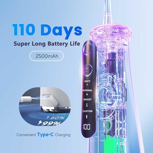 • [110 Days Powerful Battery Life, IPX7 Waterproof]: The water flosser offers an incredible 110 days of continuous use on a single charge. Say goodbye to the hassle of constantly recharging and hello to a long-lasting, powerful water dental flosser. With double-sealing rings dvanced IPX7 waterproof technology, allowing you to use it while showering
