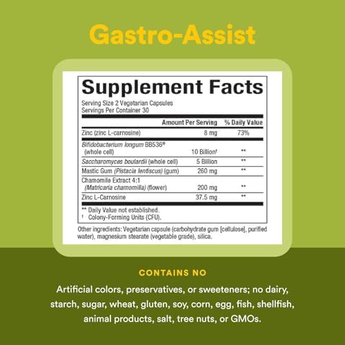 Gastro-Assist is a digestive supplement formulated to support a healthy intestinal tract and balance of gut flora. Each serving delivers a combination of mastic gum, zinc L-carnosine, chamomile and probiotic strains. Mastic gum and chamomile are included to help soothe digestive discomfort, while probiotics like Bifidobacterium longum support relief from occasional diarrhea, constipation, gas and bloating. To help provide a protective layer for the stomach and intestine lining, our formula includes zinc L-carnosine. Saccharomyces boulardii helps restore the balance of microflora essential to cultivate a healthy digestive system. Suitable for vegetarian and vegan diets. This dietary supplement is third-party certified by ISURA, which tests for GMOs and about 800 contaminants.