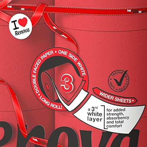 - JUMBO ROLLS : This premium toilet paper comes in pack of 6 huge rolls with roll dimensions of 4" wide by 5" diam Inches. Featuring 180 sheets per roll, you get more bathroom tissue sheets than Renova regular size rolls, with also taller sheet size (4.8"L x 4"H), keeping you from changing the roll as often and adding a stylish added strength and softness