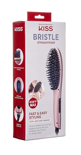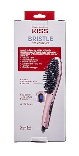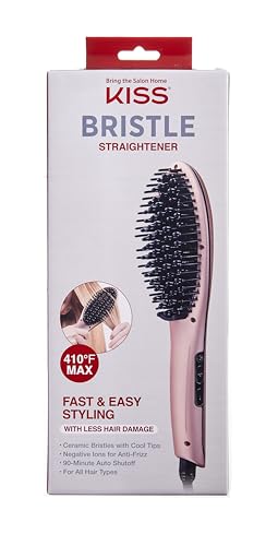 KISS Bristle Hair Straightener Heat Brush, Digital Temperature Control Up to 410°F, 90-Minute Auto Shutoff, Cool-Tip Ionic Bristles, Lightweight Handle, 360° Swivel Cord, Pink, 1.25 lbs