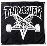 - A 36x36 inch polyester banner featuring a printed Skategoat logo, equipped with metal grommets at each corner. Available in black with a white logo.