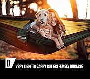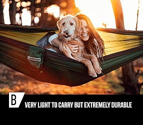Nylon EASY TO SET UP AND TAKE DOWN - Setting up this big 10 ft long 6 ft wide camping hammock can be done in a matter of minutes, Taking down our portable hammock is just as simple. Add To Cart Now. VERY COMFORTABLE AND DURABLE - Our 2 person hammock is very durable, sturdy and has the highest quality stitching for you to spread out and enjoy your surroundings which is important for any hiking gear when backpacking. COMPACT AND LIGHTWEIGHT CAMPING GEAR - Weighing only 1.5lbs our folding packable double hammock packs up easy for storing and is small and light making it perfect to carry for any hiking trip. PLENTY OF ROOM - The Bear Butt travel hammock has so much room for Two people to fit comfortably and with a legal weight capacity of 500lbs you can enjoy time with loved ones hammock camping. Get Yours Now. THE COMPLETE SET UP - Our hammocks for camping is attached to a small compact travel bag that comes with everything you will need to be set up making ths a perfect outdoor hammock for any adventure.