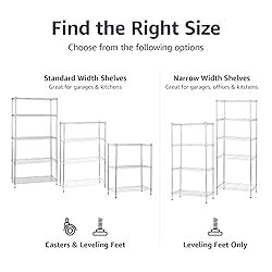 4 shelf wire rack offers handy storage space and easy access to tools and supplies Durable steel construction with a Chrome finish; weight capacity per shelf: 350 pounds with leveling feet, 110 pounds with wheels not in motion, and 88 pounds with wheels in motion; weight capacity overall: 1400 pounds with leveling feet, 440 pounds with wheels not in motion, and 353 pounds with wheels in motion (based on evenly distributed weight) Adjustable shelf height in 1-inch increments for customizing; 4 leveling feet for stability; 3-inch caster wheels for easy maneuvering Multi-purpose versatility; use in a garage, laundry room, kitchen, playroom, or other living or work space Assembles quickly and easily; no tools needed Product Dimensions: 36 x 14 x 57.75 inches (LxWxH)